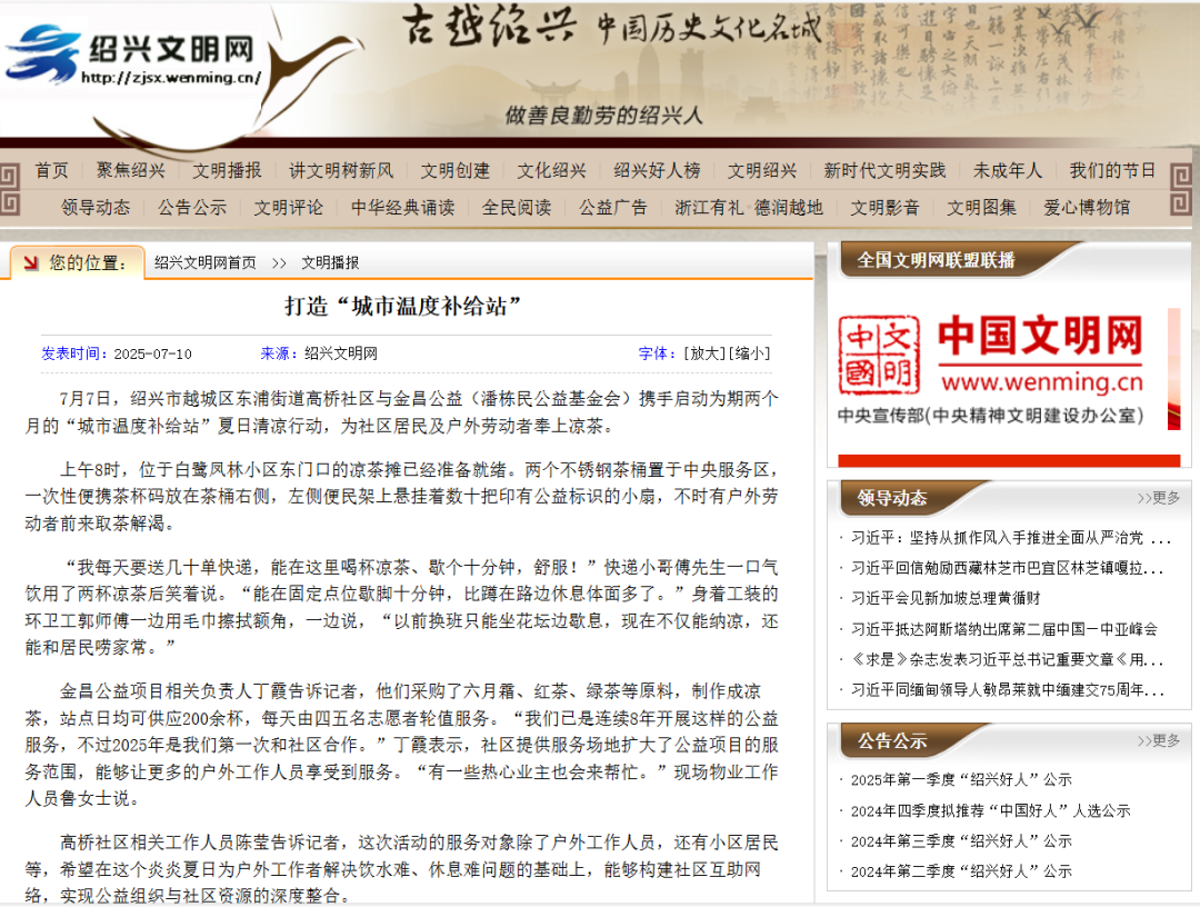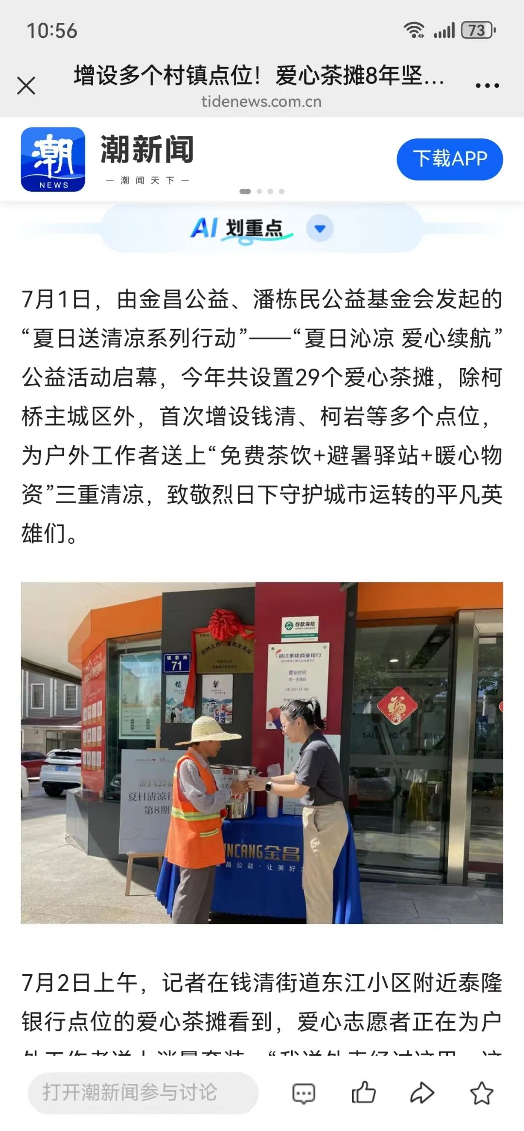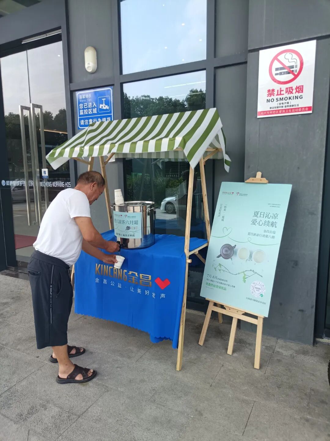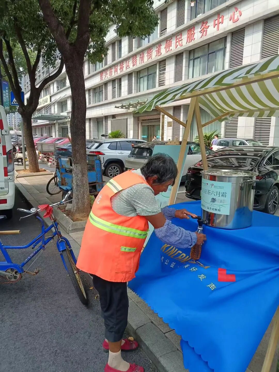 在众人的热切期盼中,备受称赞的“清凉行动”有了暖心新进展——爱心茶摊扩容了!得知清街道星城护理医院和兴发公寓周边户外工作者多、解暑需求迫切,金昌公益和潘栋民公益基金会迅速行动,商讨方案、筹备物资,很快决定在这两处新增茶摊。