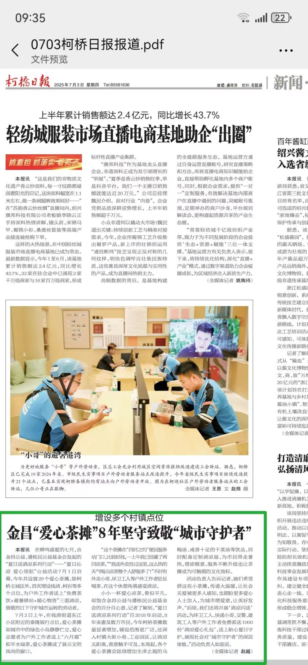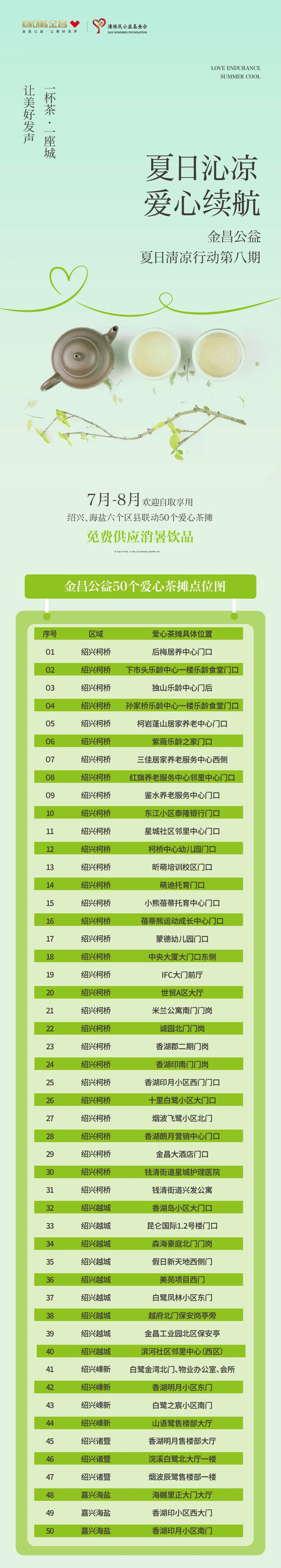 每一杯递出的凉茶,都承载着满满的关怀与祝福;每一个茶摊的存在,都如同夏日里的一座座清凉港湾,为高温下的人们送去丝丝凉意与浓浓温情。在这个炎热的夏天,让我们一同走进这50个爱心茶摊,感受这份来自城市的清凉与爱意,让美好在茶香中、在城市里、在每个人心间绽放。